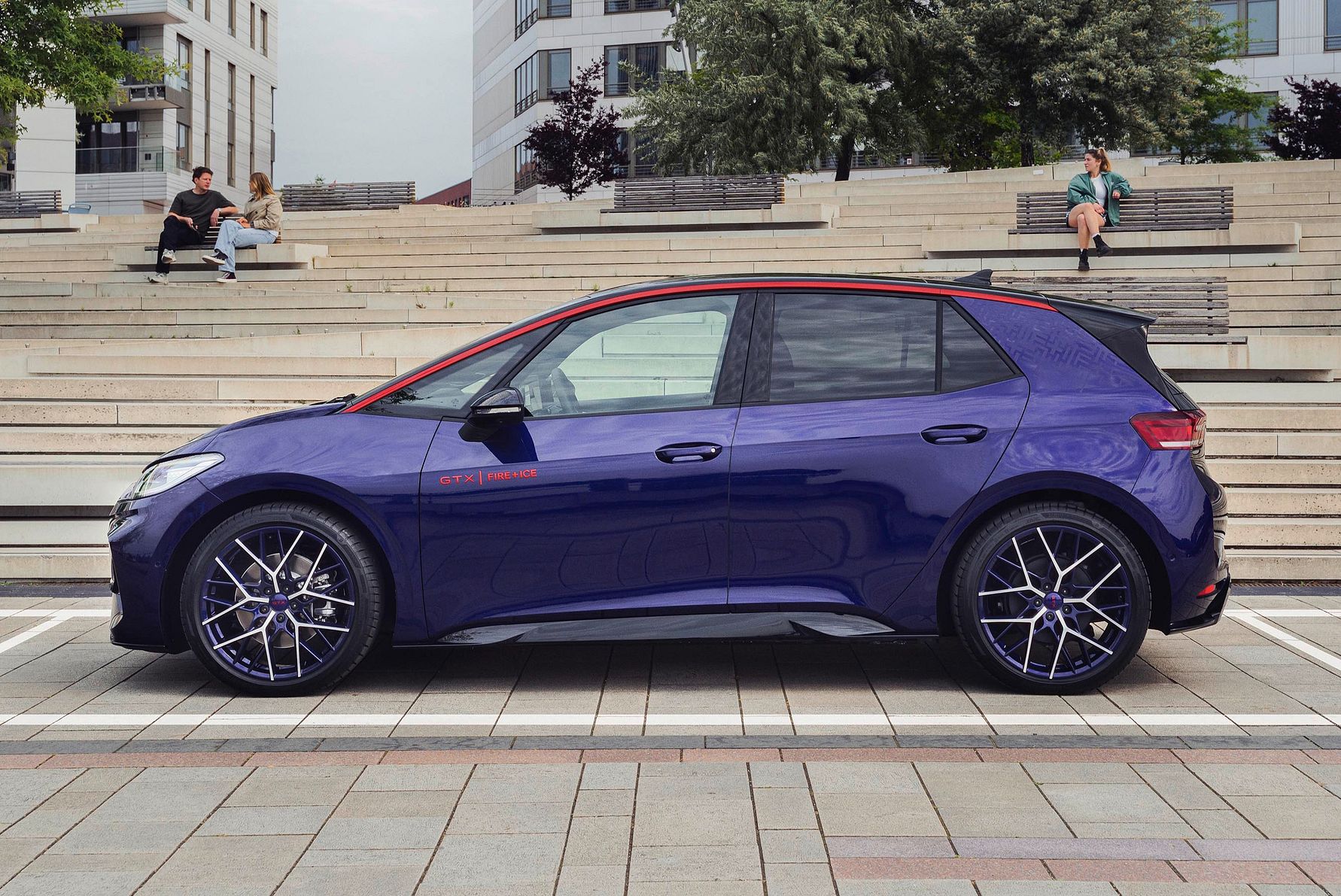 Skræddersyet design. Det vigtigste kendetegn ved ID.3 GTX FIRE+ICE's ydre er dens Ultra Violet Metallic-lak. Denne unikke farve er en hyldest til den legendariske Golf-forgænger, som fandtes i en lignende nuance. Taglisten tilføjer også et sporty touch med sin kraftige Flaming Redanodiserede C-stolpen er prydet med et gennemsigtigt mat mærkat med det geometriske FIRE+ICE- mønster. Derudover bærer tagspoileren Fire-and-Ice-logoet fra 1990'erne. En anden iøjnefaldende detalje er de 20-tommer store Locarno-letmetalfælge, der understreger bilens dynamik med Ultra Violet Metallic anodiseret lakering, en højglans finish og en markant rød GTX-navkapsel. Den nyeste generation af LED-baglygter er tonet eksklusivt på denne specialmodel. Et andet højdepunkt kommer i form af de lysprojektioner, der vises, når dørene åbnes, og som viser grafik, der repræsenterer elementerne ild og is på henholdsvis førersiden og passagersiden.